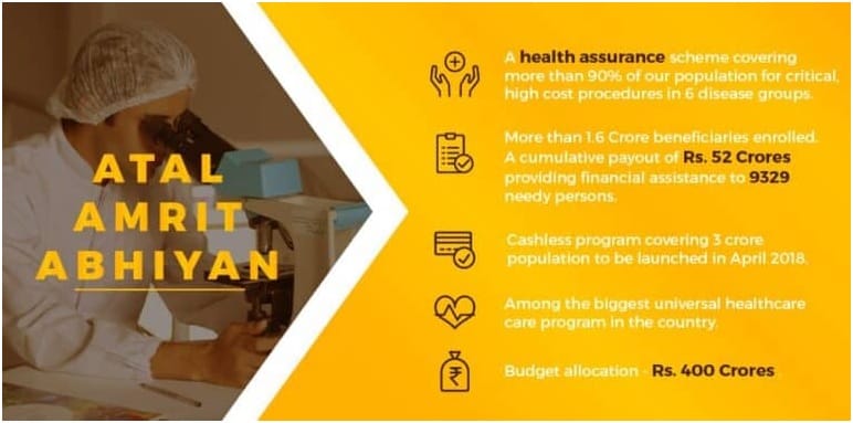 अटल अमृत अभियान के तहत, पात्र लाभार्थियों को बीमा कवर के आधार पर अस्पताल में उपचार के समय योजना का लाभ मिलता है। कैंसर, हृदय रोग, कैंसर, गुर्दा रोग, नव-नवजात रोग, मस्तिष्क और हृदय से संबंधित बीमारियों और जलने की चोटों जैसी विभिन्न बीमारियों को योजना में शामिल किया गया है। लाभार्थी केवल राज्य के सरकारी सहायता प्राप्त और सीजीएचएस के अस्पताल में इलाज के लिए जा सकता है। 23 मार्च 2021 तक AAA के तहत 245,491 APL नामांकन, 15,889,339 BPL नामांकन और 85,717 उपचार हुए हैं।