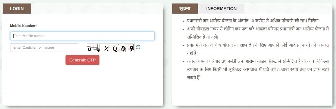 कैशलेस इलाज का लाभ उठाने के लिए सभी नागरिक यह जांच सकते हैं कि उनका नाम लाभार्थियों की सूची में है या नहीं। संपूर्ण ग्रामीण और शहरी सूची डाउनलोड करने के लिए https://mera.pmjay.gov.in/search/login लिंक पर क्लिक करें। फिर आयुष्मान भारत हरियाणा लाभार्थी सूची की जाँच करने वाला पृष्ठ दिखाई देगा: –
