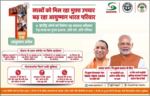 आयुष्मान भारत की प्रथम वर्षगांठ पर विशेष आयोजन किया जा रहा है। वर्षगांठ पर विशेष गोल्डन कार्ड का वितरण किया जायेगा। आयुष्मान भारत के लाभार्थी परिवारों के गोल्डन कार्ड बनाने के लिए उत्तर प्रदेश सरकार ने इसी महीने अभियान शुरू किया है। सितम्बर महीने चलने वाले अभियान के तहत जान सुविधा केंद्रों, जिला हॉस्पिटल तथा योजना में सूचिबद्धा अस्पतालों में गोल्डन कार्ड बनाये जाएंगे। इस योजना की पूरी जानकारी नीचे दी हुयी है….इसके अलावा अन्य कैंप भी लगाए जायेंगे। पूरी जानकरी के लिए नीचे दी गयी इमेज को देखें :-