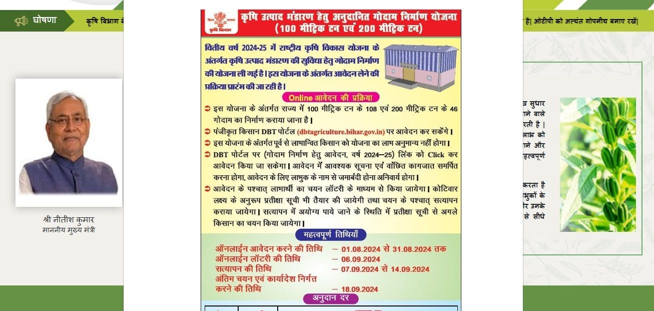 बिहार कृषि विभाग ने कृषि उत्पादन भंडारण के लिए गोदाम निर्माण पर किसानों का अनुदान देने का फैसला किया है। जिसके लिए राष्ट्रीय कृषि विकास योजना के तहत बिहार गोदाम निर्माण योजना का शुभारंभ किया गया है। इस योजना के माध्यम से किसानों को कृषि उत्पादों को बेहतर तरीके से संचित करने के लिए आवश्यक सुविधाएं प्रदान की जाएगी। बिहार गोदाम निर्माण योजना के तहत राज्य के सभी वर्गों के किसानों को लाभ दिया जाएगा। बिहार कृषि विभाग के आधिकारिक वेबसाइट पर जाकर राज्य के इच्छुक किसान लाभ प्राप्त करने के लिए ऑनलाइन आवेदन कर सकते हैं। लेकिन उससे पहले किसानों को डीबीटी कृषि विभाग बिहार सरकार की आधिकारिक वेबसाइट पर अपना पंजीकरण करना होगा। सरकार द्वारा इस योजना के तहत दी जाने वाली अनुदान राशि सीधे लाभार्थी के बैंक खाते में भेजी जाएगी। ताकि उन्हें गोदाम निर्माण में सहयोग मिल सके। और उनकी फसलें सुरक्षित रहे।