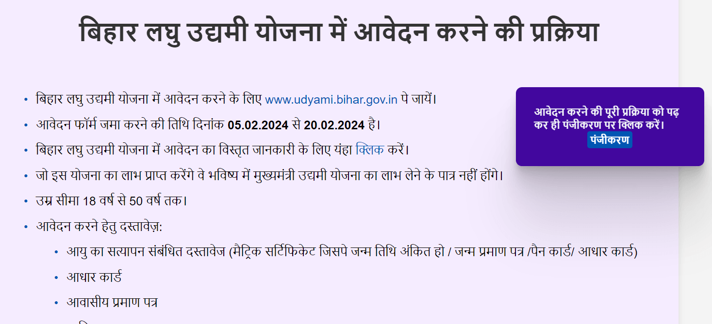 - इस पेज पर आपको बिहार लघु उद्यमी योजना की प्रक्रिया को पढ़ कर पंजीकरण के ऑप्शन पर क्लिक करना होगा।