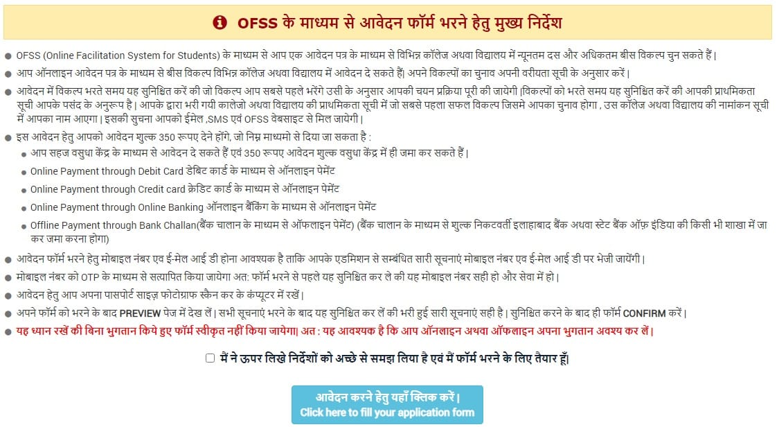 - अगली विंडो में, सभी आवश्यक निर्देशों को ध्यान से पढ़ें (आवेदन फॉर्म भरने के लिए मुख्य निर्देश), डिक्लेरेशन पर टिक करें और फिर नीचे “Click Here to Fill Your Application Form” टैब पर क्लिक करें।