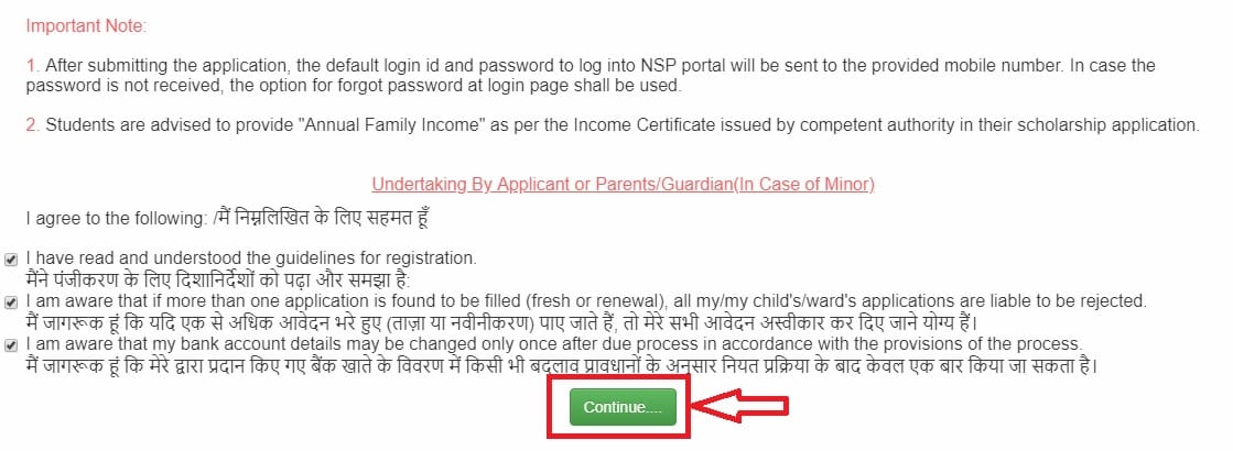 - अब आपके सामने एक पेज खुलकर आएगा। उसपर scroll करके नीचे आइये और तीन बॉक्सेस को टिक करके continue… पर क्लिक करें।