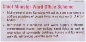 - मुख्मंत्री वार्ड करालय, शहरी निकायों के विभिन्न वार्डों में रहने वाले लोगों की समस्याओं के समाधान के लिए एक स्टॉप सेंटर के रूप में कार्य करेगा।