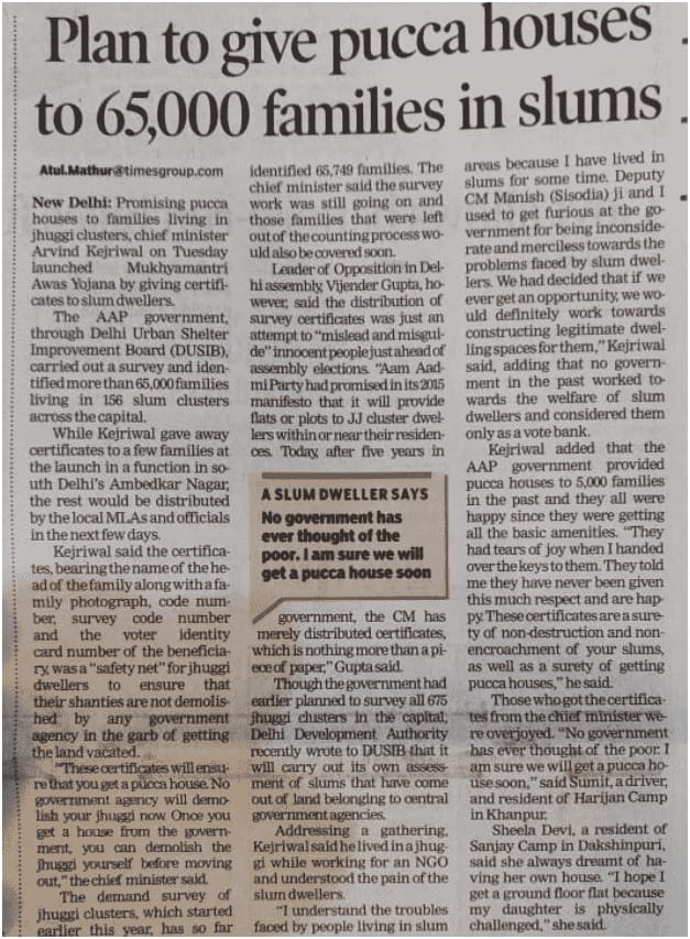 सीएम ने कहा कि वह स्लम इलाकों में लोगों के सामने आने वाली परेशानियों को समझते हैं क्योंकि वह खुद कुछ समय के लिए झुग्गियों में रहते थे। वह एक एनजीओ के लिए काम करते हुए झुग्गी में रहता था। डिप्टी सीएम मनीष सिसोदिया और सीएम केजरीवाल झुग्गी झोपडी निवासियों के सामने आने वाली समस्याओं के प्रति असंगत और निर्दयी होने के लिए गुस्से में थे। दोनों ने झुग्गी निवासियों के लिए वैध निवास स्थान बनाने की दिशा में काम करने का फैसला किया। उन्होंने झुग्गीवासियों के कल्याण के लिए काम नहीं करने और उन्हें केवल वोट बैंक के रूप में मानने के लिए पिछले सरकार का नारा दिया।