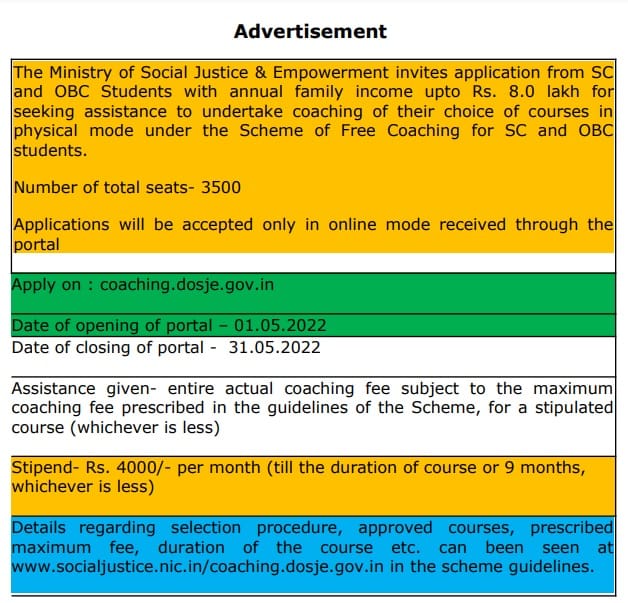 31 मई 2022 SC / OBC छात्रों के लिए मुफ्त कोचिंग योजना के लिए आवेदन पत्र भरने की अंतिम तिथि है।
