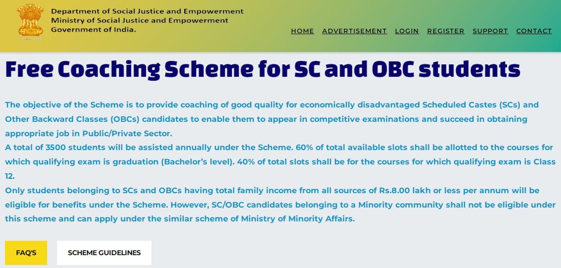 एससी और ओबीसी छात्रों के लिए नि: शुल्क कोचिंग के लिए योजना के लिए ऑनलाइन आवेदन करने के लिए आधिकारिक वेबसाइट शुरू की गई है, जिसे लिंक का उपयोग करके एक्सेस किया जा सकता है —