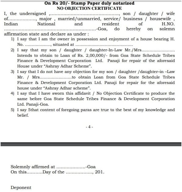 गोवा सरकार ने आश्रय आधार योजना के तहत गृह ऋण सहायता को 2 लाख रुपये से बढ़ाकर 5 लाख रुपये कर दिया है। इस आवास ऋण योजना के तहत अनुसूचित जनजाति (एसटी) श्रेणी के सभी लोग घर के मरम्मत / नवीनीकरण के लिए ऋण के रूप में प्रति वर्ष 2% साधारण ब्याज के रूप में 5 लाख रुपये की वित्तीय सहायता प्राप्त कर सकते हैं। अब एसटी श्रेणी के आवेदक सहायता राशि प्राप्त करने के लिए शपथ पत्र और अनापत्ति प्रमाण पत्र (एनओसी) के लिए प्रारूप डाउनलोड कर सकते हैं।