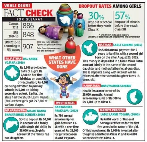 गुजरात राज्य सरकार ने 2019 में लिंग अनुपात में सुधार के लिए Vhali Dikri Yojana शुरू की है जो वर्तमान में प्रति 1000 लड़कों पर 883 लड़कियों की है। शादी या उच्च शिक्षा के लिए वाहिनी डिकारी योजना के तहत राशि प्रदान की जाएगी। हाल ही में हुए गुजरात बजट 2019-20 में, राज्य सरकार ने Vahli Dikri Yojana के लिए 133 करोड़ रुपये आवंटित किए हैं।