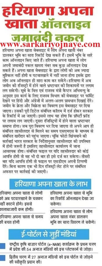 Latest News :- हरियाणा अपना खाता वेबसाइट में लोग अपना खाता नंबर डालकर अपनी भूमि का सारा रिकॉर्ड देख सकते है। अपना खाता वेबसाइट के द्वारा अब लोगों को दिक्क्त नहीं होगी और उन्हें पटवारखाने में नहीं जाना होगा। पूरी जानकारी के लिए नीचे दी गयी इमेज को देखें :-