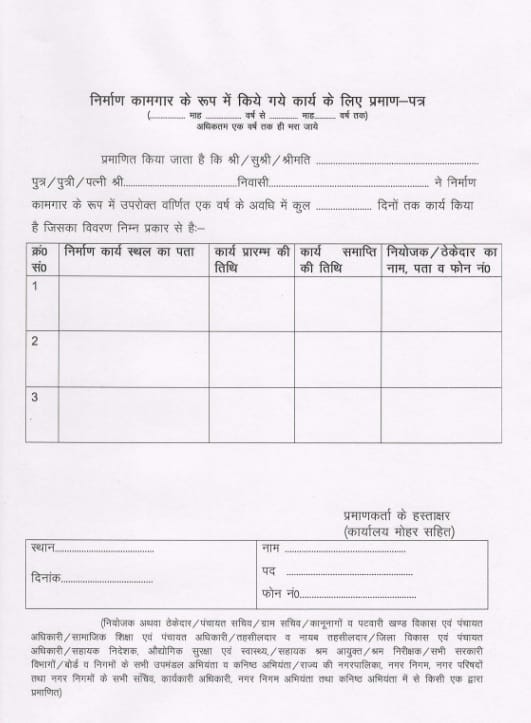 हरियाणा श्रम के लिए साइकिल योजना के लिए BOCW बोर्ड वर्क स्लिप (काम पर्ची)