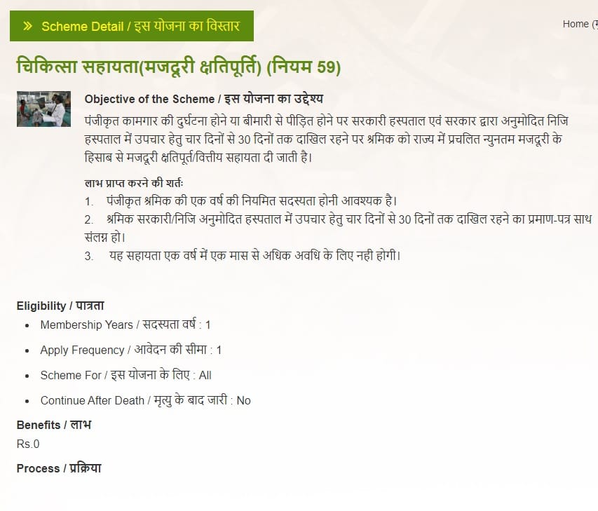 - सभी मजदूरों को न्यूनतम 4 दिनों से अधिकतम 30 दिनों तक सरकार / सरकारी सहायता प्राप्त अस्पतालों में इलाज के लिए भर्ती होना चाहिए। इसके लिए उन्हें अस्पताल का प्रमाण पत्र या प्रमाण प्रस्तुत करना होगा।