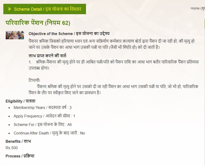 पूरा हरियाणा श्रम परिवार पेंशन विवरण पढ़ने के लिए, लिंक पर क्लिक करें – https://hrylabour.gov.in/bocw/settings/schemeDetail/119