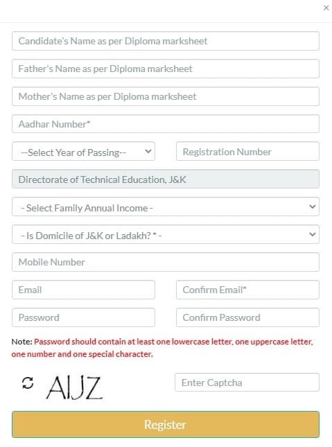- امیدوار کا نام، والد کا نام، ماں کا نام، آدھار نمبر، موبائل نمبر، ای میل آئی ڈی، پاس ورڈ، پاس ہونے کا سال منتخب کریں، خاندان کی سالانہ آمدنی، ڈومیسائل کی حیثیت کا انتخاب کریں اور “Register” بٹن پر کلک کریں۔