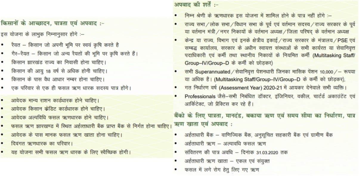 - झारखंड सरकार से कर्जमाफी चाहने वाले आवेदक को एक रैयत-किसान होना चाहिए जो अपनी जमीन पर अपनी जमीन पर कृषि गतिविधियों को अंजाम देता हो। यहां तक कि गैर-रैयत यानी दूसरे की जमीन पर कृषि कार्य करने वाले किसान भी शामिल हैं।