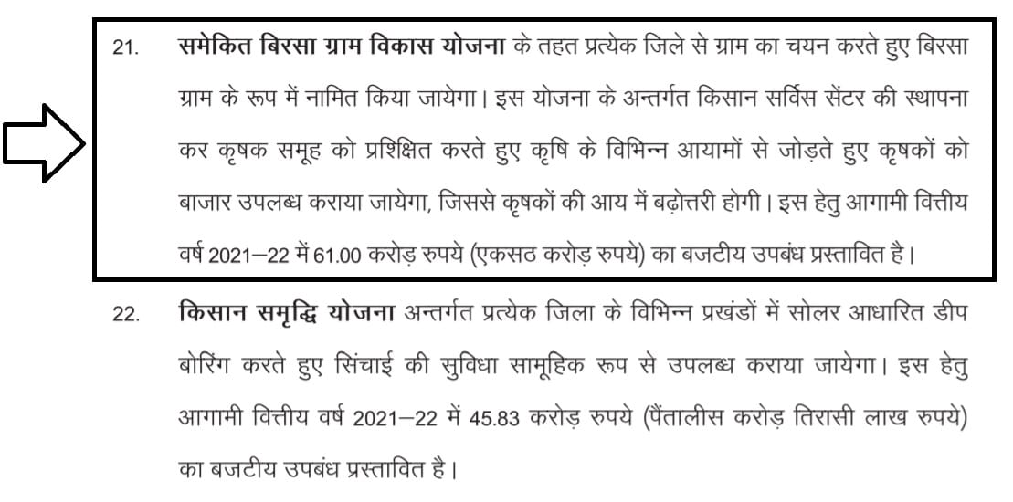समेकित बिरसा ग्राम विकास योजना के तहत प्रत्येक जिले से ग्राम का चयन करते हुए बिरसा ग्राम के रूप में नामित किया जायेगा। इस योजना के अन्तर्गत किसान सर्विस सेंटर की स्थापना कर कृषक समूह को प्रशिक्षित करते हुए कृषि के विभिन्न आयामों से जोड़ते हुए कृषकों को बाजार उपलब्ध कराया जायेगा, जिससे कृषकों की आय में बढ़ोत्तरी होगी। इस हेतु आगामी वित्तीय वर्ष 2021-22 में 61.00 करोड़ रुपये (एकसठ करोड़ रुपये) का बजटीय उपबंध प्रस्तावित है।