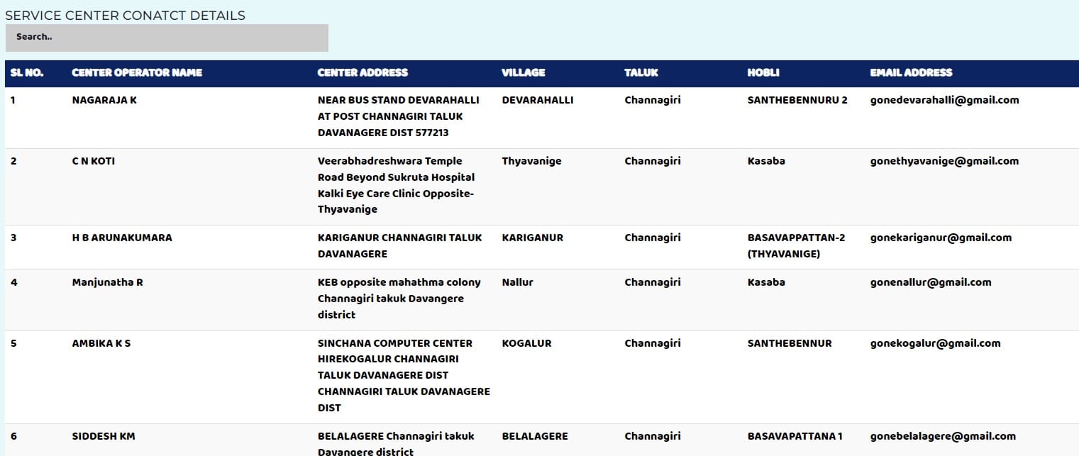 ಕೇಂದ್ರದ ನಿರ್ವಾಹಕರ ಹೆಸರು, ಕೇಂದ್ರದ ವಿಳಾಸ, ಗ್ರಾಮ, ತಾಲೂಕು, ಹೋಬಳಿ, ಇ-ಮೇಲ್ ವಿಳಾಸ ಸೇರಿದಂತೆ ಗ್ರಾಮ ಒನ್ ಕೇಂದ್ರಗಳ ಪಟ್ಟಿಯನ್ನು ಹೊಂದಿರುವ ಪುಟವು ತೆರೆಯುತ್ತದೆ:-