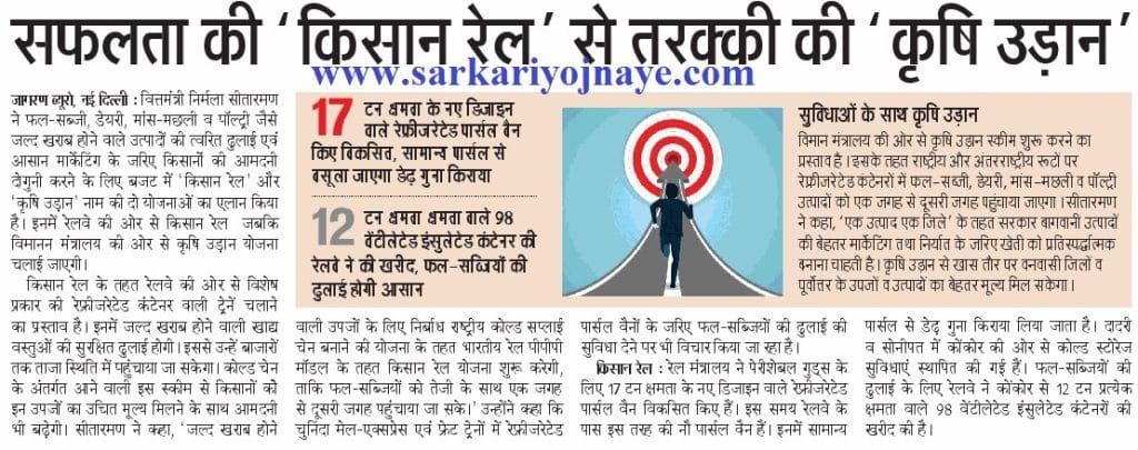Latest Update :- वित्त मंत्री निर्मला सीतारमण ने फल, सब्जी डेरी, मांस मछली पोल्ट्री जैसे जल्द ख़राब होने वाले उत्पादों की त्वरित ढुलाई और आसान मार्केटिंग के जरिए किसानों की आमदनी दोगुनी करने के लिए बजट में किसान उड़ान योजना का एलान किया है। पूरी जानकारी के लिए नीचे दी गयी इमेज को देखें :-