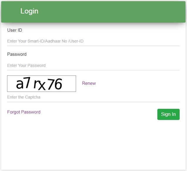 - ഉപയോക്തൃ ഐഡികൾ നിങ്ങളുടെ സ്മാർട്ട് ഐഡിയോ ആധാർ നമ്പറോ ഡിപ്പാർട്ട്മെന്റിന്റെ അഡ്മിൻ സൃഷ്ടിച്ച ഒരു യൂസർ ഐഡിയോ ആകാം.