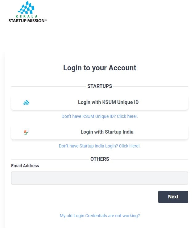 - ഇവിടെ നിങ്ങൾക്ക് നിങ്ങളുടെ KSUM തനത് ഐഡി ഉപയോഗിച്ചോ സ്റ്റാർട്ടപ്പ് ഇന്ത്യ അല്ലെങ്കിൽ ഇമെയിൽ വിലാസം ഉപയോഗിച്ചോ ലോഗിൻ ചെയ്യാം, തുടർന്ന് startupmission.kerala.gov.in ലോഗിൻ ചെയ്യാൻ “അടുത്തത്” ബട്ടൺ ക്ലിക്ക് ചെയ്യുക.