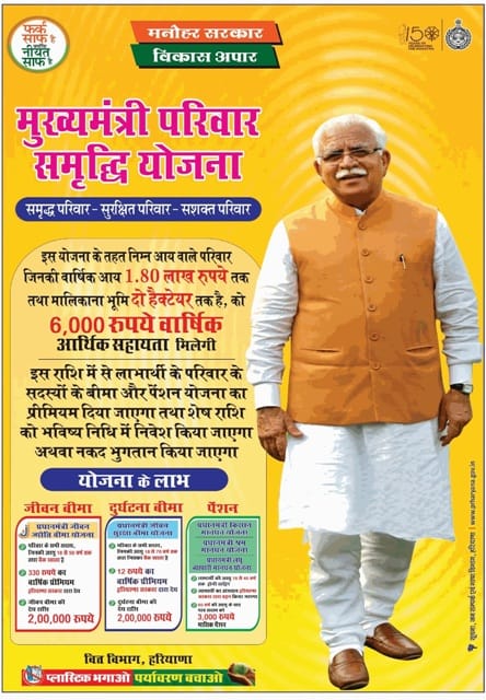 हरियाणा के मुख्यमत्री ने राज्य के राज्य के सभी नागरिकों के लिए परिवार समृद्धि योजना शुरू करने की घोषणा की है। यह योजना 21 अगस्त से पूरे राज्य में लागु हो जाएगी। इस योजना के तहत हर परिवार को सालाना 6000 रूपए दिए जायेंगे। इस योजना में 6000 रूपए जीवन बीमा, आकस्मिक बीमा और पेंशन लाभ के रूप में सामाजिक सुरक्षा प्रदान किया जायेगा। इस योजना के लिए राज्य सरकार ऑनलाइन आवेदन CSC सेंटर के माध्यम से भी करा सकती है। योजना में परिवारों की पहचान परिवार पहचान पत्र के माध्यम से की जाएगी। इस योजना के तहत लाभ प्राप्त करने के लिए परिवार की वार्षिक आय 180,000 रूपए या इससे कम होनी चाहिए।