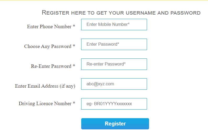 - आपको अपना Mobile No, Password, Re Password, Email ID और Driving Licence No. आदि दर्ज करना होगा।