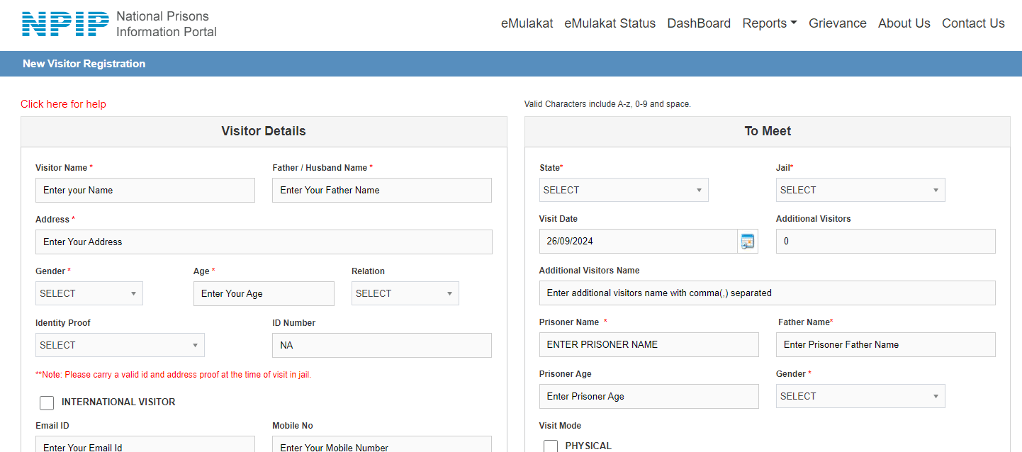 | पोर्टल का नाम | एनपीआईपी ई-मुलाकात पंजीकरण |
