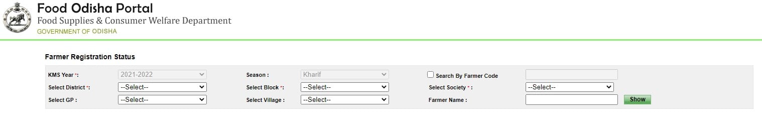 - ଏଠାରେ KMS ବର୍ଷ, season ତୁ ସ୍ auto ତ selected ମନୋନୀତ ହୋଇଛି, ଜିଲ୍ଲା, ବ୍ଲକ, ସମାଜ, ଗ୍ରାମ ପଞ୍ଚାୟତ, ଗ୍ରାମ, କୃଷକଙ୍କ ନାମ ପ୍ରବେଶ କରନ୍ତୁ ଏବଂ ତା’ପରେ ଅନଲାଇନ୍ ମୋଡ୍ ମାଧ୍ୟମରେ କୃଷକ ପଞ୍ଜିକରଣ ସ୍ଥିତି ଯାଞ୍ଚ କରିବାକୁ “Show” ବଟନ୍ କ୍ଲିକ୍ କରନ୍ତୁ | ଆପଣ କୃଷକ ସଂକେତ ଦ୍ୱାରା ଓଡିଶା କୃଷକ ପଞ୍ଜୀକରଣ ସ୍ଥିତିକୁ ମଧ୍ୟ ଯାଞ୍ଚ କରିପାରିବେ |
