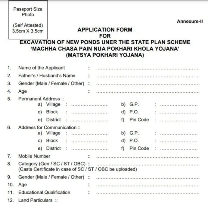 ନିର୍ଦ୍ଦିଷ୍ଟ ଆବେଦନ ଫର୍ମାଟ୍ ଯାହା ଲିଙ୍କ୍ ମାଧ୍ୟମରେ ଡାଉନଲୋଡ୍ ହୋଇପାରିବ – http://www.fardodisha.gov.in/sites/default/files/misc/7.%20Excavation%20of%20New%20Ponds%20under%20Machha%20Chasa%20Pain%20Nua%20Pokhari%20Khola%20Yojana%20%28Matsya%20Pokhari%20Yojana%29.pdf।