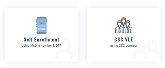 - यहां लोग ऑनलाइन आवेदन करने के लिए पंजीकरण की प्रक्रिया को “Self Enrollment (using mobile number & OTP)” या “CSC VLE (using CSC connect)” चुन सकते हैं। For Self Enrollment process, आवेदकों को पंजीकृत मोबाइल नंबर पर मोबाइल नंबर और ओटीपी के माध्यम से लॉगिन करना होगा।