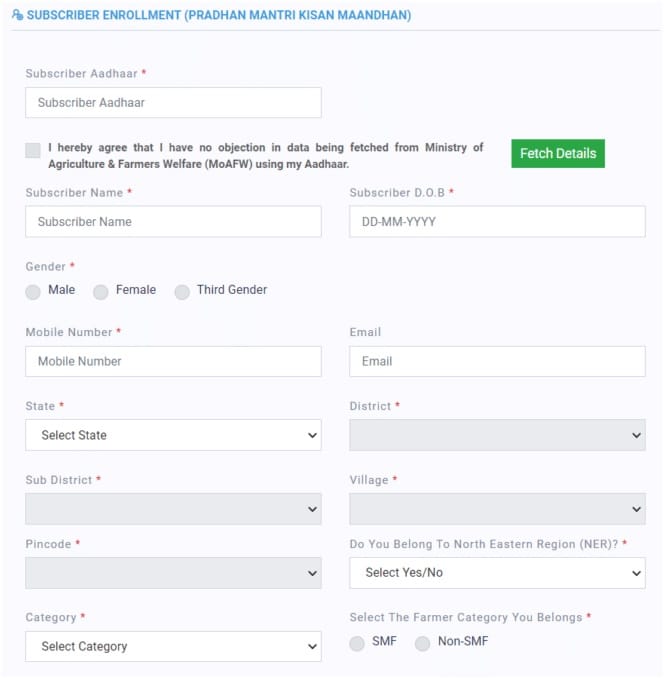 पीएम किसान मानधन योजना सब्सक्राइबर नामांकन फॉर्म किसानों से जन्म तिथि, आधार नंबर, मोबाइल नंबर, ई-मेल आईडी और अन्य विवरण मांगता है। 18 से 40 वर्ष (पात्रता) आयु वर्ग के लाभार्थी किसानों को प्रीमियम का भुगतान करना होगा। किसानों की उम्र के आधार पर प्रीमियम राशि की सीमा 55 रुपये से 200 रुपये है जो किसानों के पीएम किसान सम्मान निधि बैंक खाते से ऑटो-कटौती के विकल्प के साथ आती है।