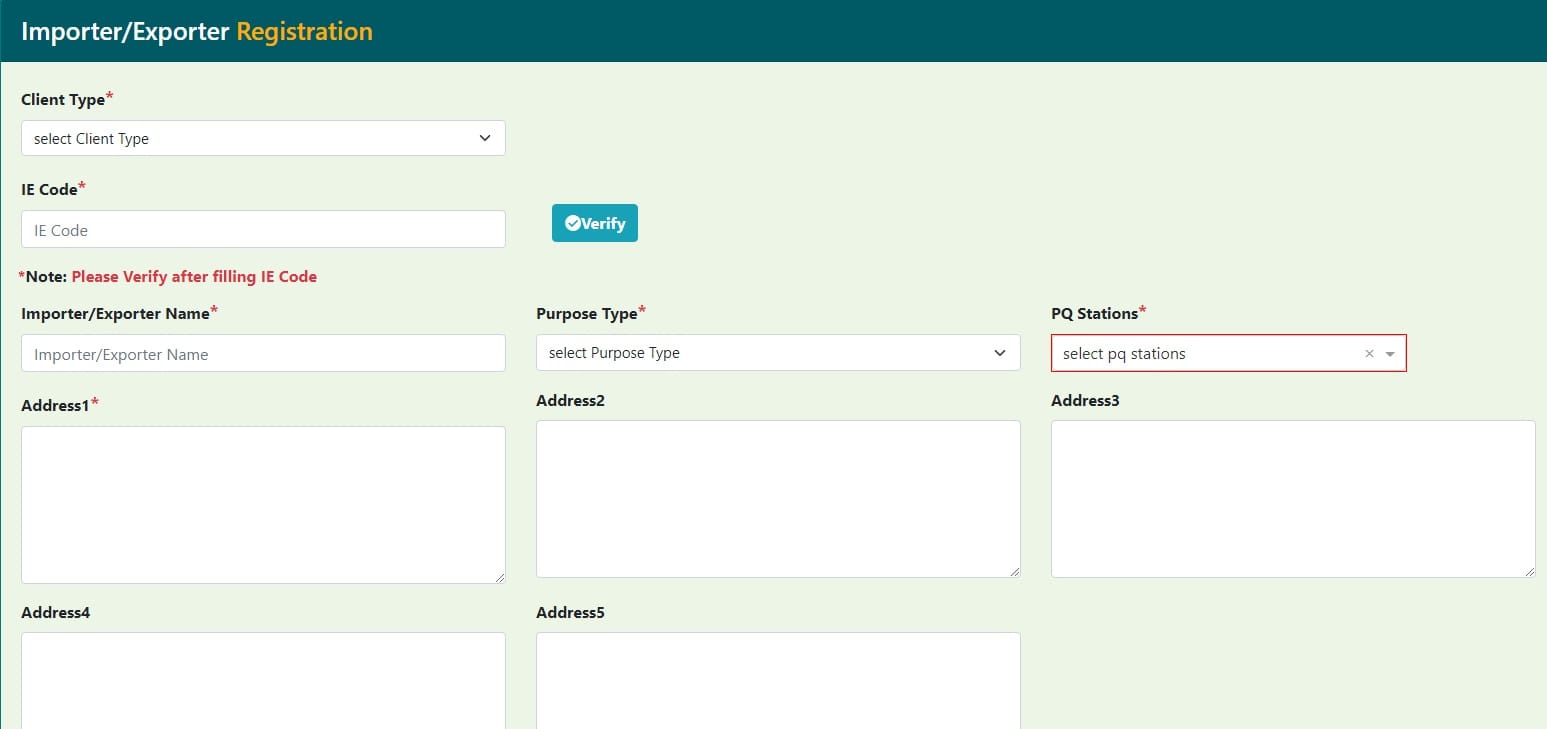 - यहां क्लाइंट प्रकार का चयन करें, फिर आईई कोड, आयातक / निर्यातक का नाम, उद्देश्य प्रकार, पीक्यू स्टेशन, पता, संपर्क नंबर, ई-मेल आईडी, पासवर्ड दर्ज करें और फिर “Register” बटन पर क्लिक करें।