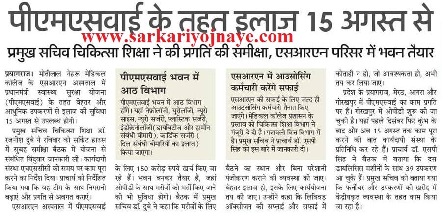 Latest News:- मोतीलाल नेहरू मेडिकल कॉलेज के एसआरएन अस्पताल में पंससि के तहत बेहतर और आधुनिक उपकरणों से इलाज की सुविधा 15 अगस्त से उपलब्ध हो चुकी है। PMSSY भवन में कुल आठ विभाग होंगे। पूरी जानकारी के लिए नीचे दी गयी इमेज को देखे :-