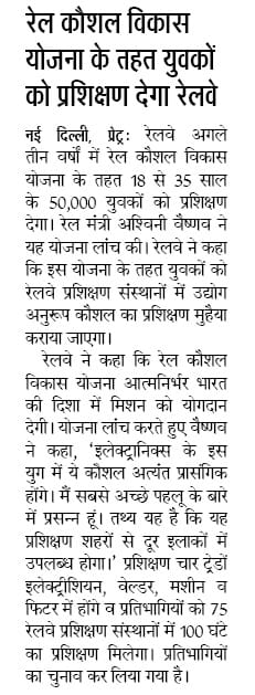 - रेल कौशल विकास योजना भारतीय रेल मंत्रालय और कौशल विकास और उद्यमिता मंत्रालय के तहत कौशल वृद्धि प्रशिक्षण कार्यक्रम में से एक है।