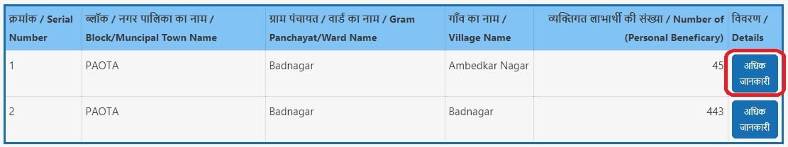 - इसमें आपके सामने तहसील, पंचायत और गांव का नाम दिखाई देगा और आपके गांव में कुल कितने लाभार्थी है वो भी दिखाई देगी। अब इसमें अधिक जानकारी पर क्लिक करें।