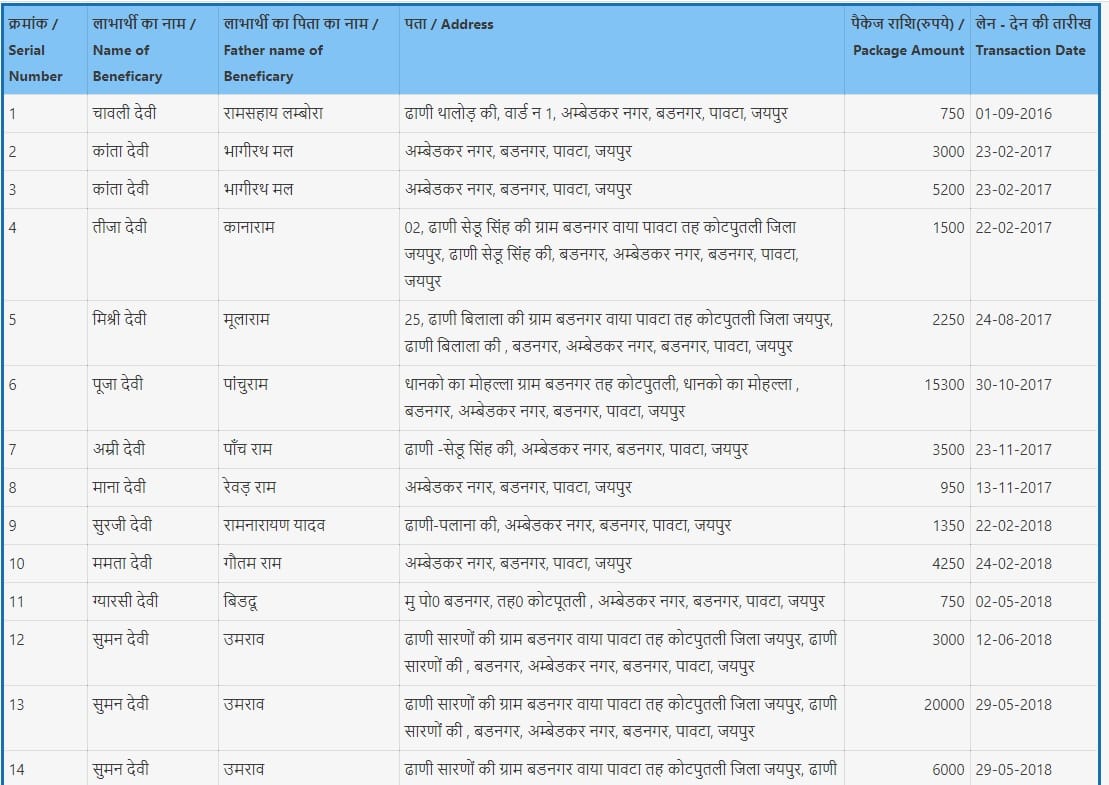 - इसमें आपको लाभार्थी का नाम, लाभार्थी का पिता का नाम, पता, पैकेज राशि(रुपये) और लेन – देन की तारीख सम्बंधित जानकारी मिल जाएगी।