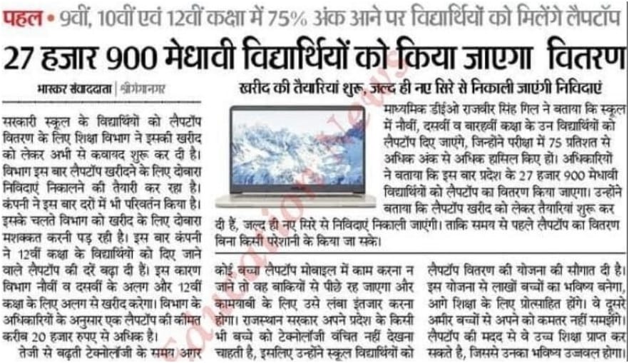 राजस्थान लैपटॉप योजना 2020 के तहत लैपटॉप वितरित किए जाएंगे। इन कक्षा के छात्रों को मुफ्त लैपटॉप वितरित किए जाएंगे। लेकिन इसका मतलब यह नहीं है कि सभी छात्र मुफ्त लैपटॉप के लिए लाभार्थी होंगे। हमने इस योजना के बारे में सभी विवरण नीचे दिए गए हैं। सभी विवरणों को ध्यान से पढ़ें। लैपटॉप उन छात्रों को वितरित किए जाएंगे, जिन्हें 8 वीं, 10 वीं और 12 वीं कक्षाओं में 75% या उससे अधिक अंक प्राप्त होंगे। रिपोर्ट के अनुसार, 27000 लैपटॉप छात्रों में वितरित किए जाएंगे।