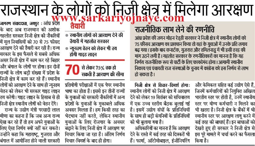 Latest News :- राजस्थान सरकार राज्य के मूल निवासियों को निजी क्षेत्र की नौकरियों में 70 से 75 फीसदी आरक्षण देने की तयारी कर रही है और गाइडलाइन के हिसाब से ही वेतन देंगे। पूरी जानकरी के लिए नीचे दी गयी इमेज को देखें :-