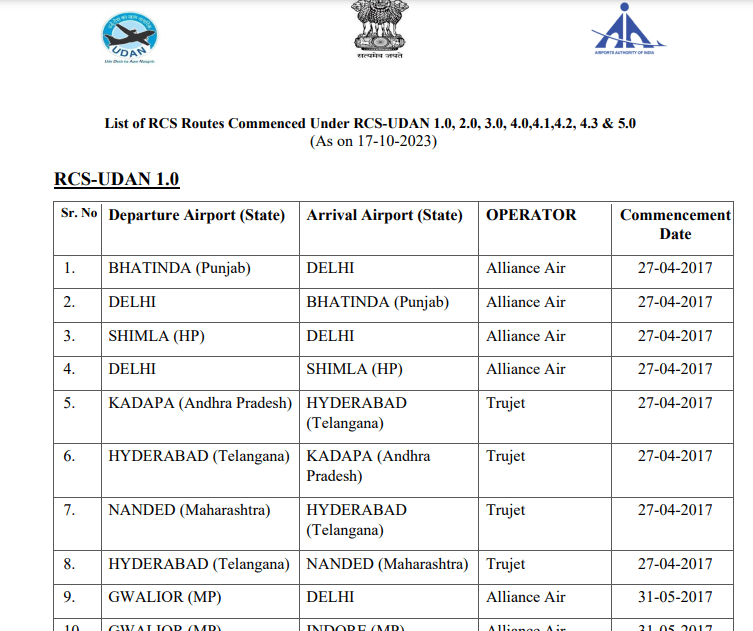 17 अक्टूबर 2023 को शुरू हुए 403 आरसीएस मार्गों की सूची यहां दी गई है – https://www.aai.aero/sites/default/files/rcs_news_notifications/499_RCS_Routes_Operationalised_as_on_17.10.2023.pdf। पीडीएफ फाइल डाउनलोड करने पर, UDAN योजना मार्गों की सूची की पूरी सूची दिखाई देगी: –