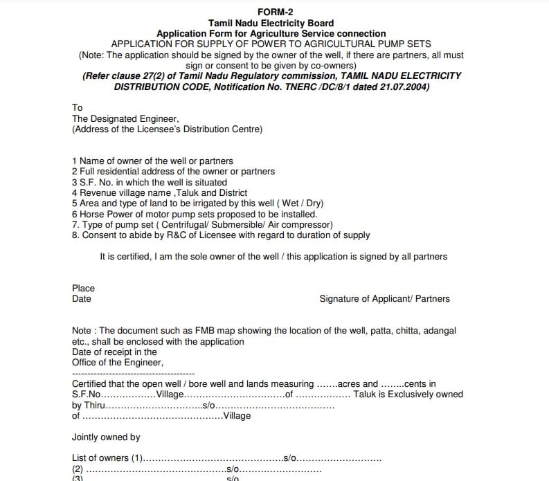 விவசாயி இலவச மின் இணைப்பைப் பெற விண்ணப்பப் படிவத்தை நிரப்ப வேண்டும். விவசாயி www.tangedco.gov.in என்ற இணையதளத்தில் விண்ணப்ப படிவத்தைப் பெறலாம். விவசாயிகள் தட்கல் திட்ட விண்ணப்ப படிவத்தை இங்கே உள்ள இணைப்பைக் கிளிக் செய்து பதிவிறக்கம் செய்யலாம்-https://www.tangedco.gov.in/linkpdf/Agri%20-Form.pdf