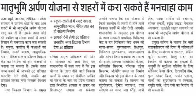सरकार ने ग्रामीण क्षेत्रों के बाद अब शहरों में भी मातृभूमि अर्पण योजना लागू कर दी है। शहरों में भी मनचाहा काम कराने के लिए 60% राशि देनी होगी, नगर विकास विभाग 40% राशि देगा। मातृभूमि योजना में 40% का योगदान सरकार देगी। इसके लिए सरकार ने 30 करोड़ रुपये का बजट रखा है। उत्तर प्रदेश सरकार ने 02 अक्टूबर 2022 को उत्तर प्रदेश मातृभूमि पोर्टल लांच किया था। ताजा जानकारी के लिए हमसे जुड़े रहे……