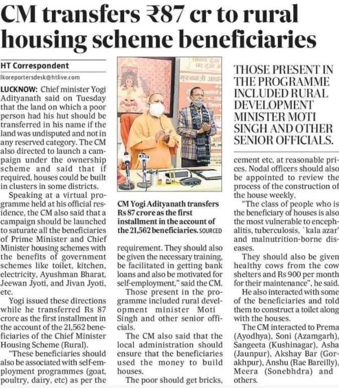 उत्तर प्रदेश के मुख्यमंत्री योगी आदित्यनाथ ने कहा कि जिस जमीन पर किसी गरीब व्यक्ति ने अपनी झोपड़ी बनाई थी, उसका जमीन उसके नाम पर हस्तांतरित की जानी चाहिए, यदि जमीन निर्विवाद रूप से और किसी आरक्षित श्रेणी में नहीं है और यदि आवश्यक हो, तो क्लस्टर में कुछ जिलों में मकान बनाए जा सकते हैं। सीएम योगी ने यह भी कहा कि शौचालय, रसोई, बिजली, आयुष्मान भारत, और जीवन ज्योति जैसी सरकारी योजनाओं के लाभ के साथ प्रधानमंत्री आवास योजना और मुख्यमंत्री आवास योजना के सभी लाभार्थियों को संतृप्त करने के लिए एक अभियान शुरू किया जाना चाहिए। मुख्यमंत्री ग्रामीण आवास योजना या मुख्यमंत्री ग्रामीण आवास योजना के 21,562 लाभार्थियों के खातों में पहली किस्त के रूप में 87 करोड़ रुपये स्थानांतरित करते हुए सीएम ने ये निर्देश जारी किए।