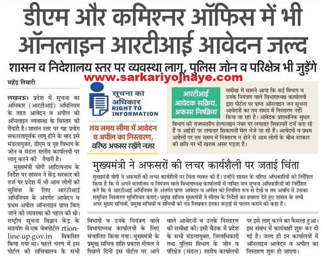 आरटीआई के तहत अब सूचना 30 दिनों में दी जायेगी। अब प्रदेश के सभी निजी स्कूल भी सूचना के अधिकार अधिनियम आरटीआई के दायरे में आएंगे। अब इन विद्यालयों को RTI के तहत मांगी गयी जानकारी देनी होगी। अब नगर निगम से सम्बंधित विभागों में जनसूचना अधिकार अधिनियम के तहत अब ऑनलाइन आरटीआई जमा कर सकते हैं। अब उत्तर प्रदेश में सूचना के अधिकार के तहत आवेदन और अपील का और विस्तार किया जाएगा। अब RTI को मंडलायुक्त (Commissioner Office), जिलाधिकारी (DM Office) व गृह विभाग (Home & Police Departments) के जोन व मंडल स्तरीय कार्यालयों में लागू किया जाएगा। पूरी जानकारी नीचे दी हुयी है….