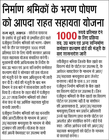 लॉकडाउन की वजह से प्रदेश के दिहाड़ी मजदूरों की रोज़ी रोटी की मदद करने के लिए राज्य सरकार ने एक स्कीम बनाई है। इस योजना के तहत योगी सरकार ने दिहाड़ी मजदूर और कंस्ट्रक्शन मजदूरों को 1-1 हजार रुपए भरण पोषण भत्ता देने का फैसला लिया है। जिससे इस विकट परिस्थिति में वह रोजमर्रा का जीवन बिना किसी परेशानी के निकाल सके।