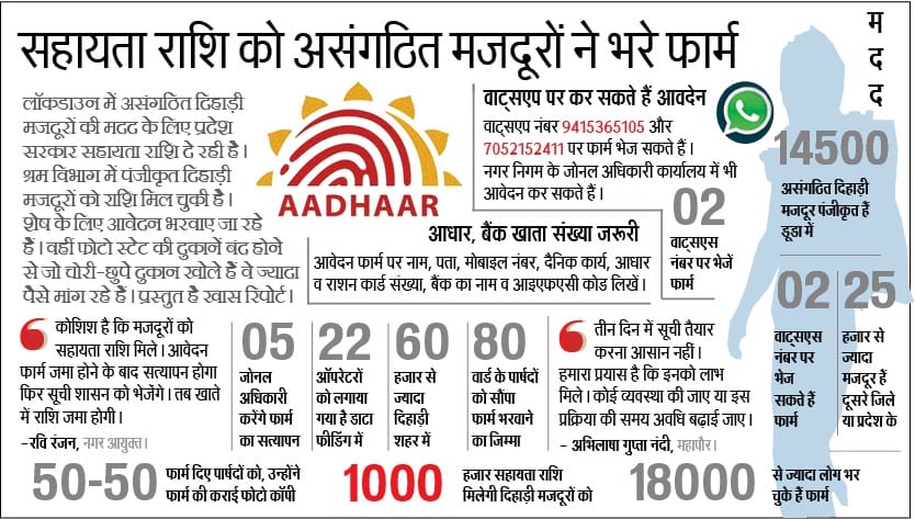 उत्तर प्रदेश सरकार ने श्रमिकों के लिए लॉक डाउन में श्रमिक भरण पोषण योजना शुरू की है, इसमें मजदूरों के खाते में 1000 रुपये भेजे जाएंगे। इससे प्रदेश में पंजीकरण 20.37 लाख निर्माण श्रमिकों को भरण पोषण के लिए प्रतिमाह भत्ता दिया जाएगा। प्रथम चरण में 5.97 लाख श्रमिकों के खाते में राशि भेजी जा चुकी है। ऐसे श्रमिक जिनका पंजीकरण श्रम विभाग या मनरेगा में नहीं है वो इस योजना का लाभ उठाने के लिए आवेदन भर सकते हैं। Whatsapp Number 9415365105, 7052152411 पर आवेदन भेज सकते हैं, पल्लेदारों और रिक्शा चालकों को भी भत्ता दिया जाएगा। पूरी जानकारी नीचे दी हुयी है……