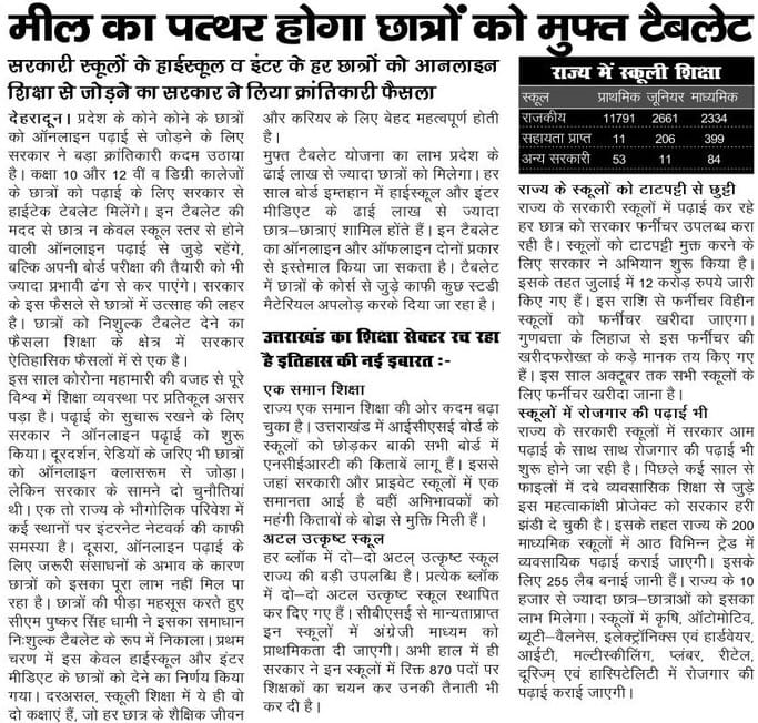 मुख्यमंत्री श्री पुष्कर सिंह धामी ने देहरादून के राजपुर रोड स्थित शासकीय कन्या इंटर कॉलेज की 100 छात्राओं को निःशुल्क टेबलेट वितरित की। शनिवार को प्रदेश की सभी 70 विधानसभाओं में यह कार्यक्रम आयोजित किया गया. सरकारी स्कूलों के 10वीं और 12वीं कक्षा के 1 लाख 59 हजार छात्रों को टैबलेट खरीदने के लिए डीबीटी के जरिए पहले ही फंड ट्रांसफर किया जा चुका है।
