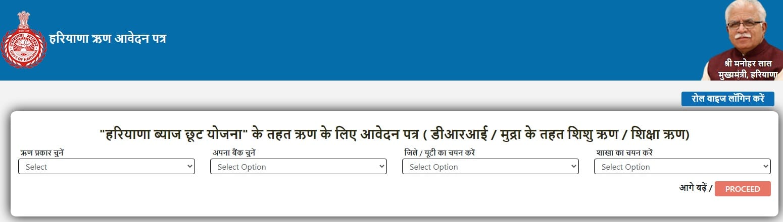 - यहां आवेदक ऋण प्रकार, बैंक, जिला / केंद्र शासित प्रदेश, शाखा का चयन कर सकते हैं और हरियाणा शिक्षा ऋण योजना ऑनलाइन पंजीकरण / आवेदन पत्र भरने के लिए “Proceed” बटन पर क्लिक कर सकते हैं।