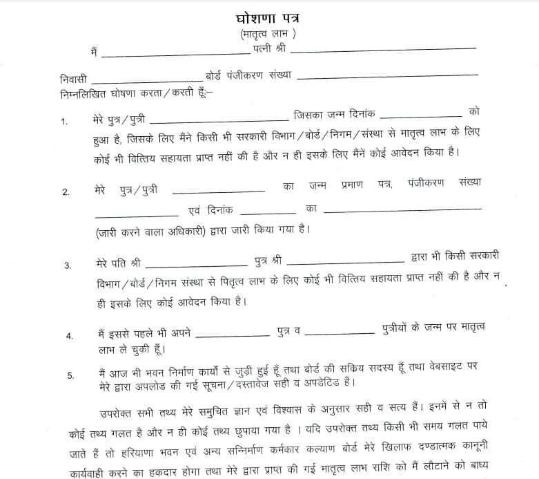 यहाँ मातृत्व लाभ दस्तावेज़ डाउनलोड करने के लिए सीधा लिंक है – http://storage.hrylabour.gov.in/uploads_new_2/bocw/scheme_undertaking/1549264214.pdf