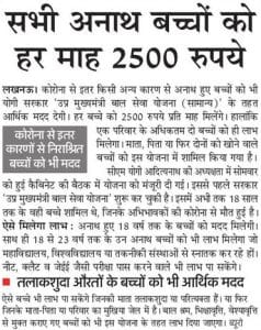 सीएम योगी आदित्यनाथ ने उन बच्चों के लिए मुख्यमंत्री बाल सेवा योजना शुरू की है, जिन्होंने कोविड -19 के कारण एक या दोनों माता-पिता को खो दिया है। उत्तर प्रदेश मुख्यमंत्री बाल सेवा योजना के तहत, राज्य सरकार एक बच्चे के अभिभावक को वित्तीय सहायता प्रदान करेगी, जबकि जिनके पास उनकी देखभाल करने वाला कोई नहीं है उन्हें बाल गृह भेजा जाएगा। यूपी सरकार कोविड-19 से अनाथ बच्चों के पालन-पोषण और शिक्षा का ध्यान रखेगी।