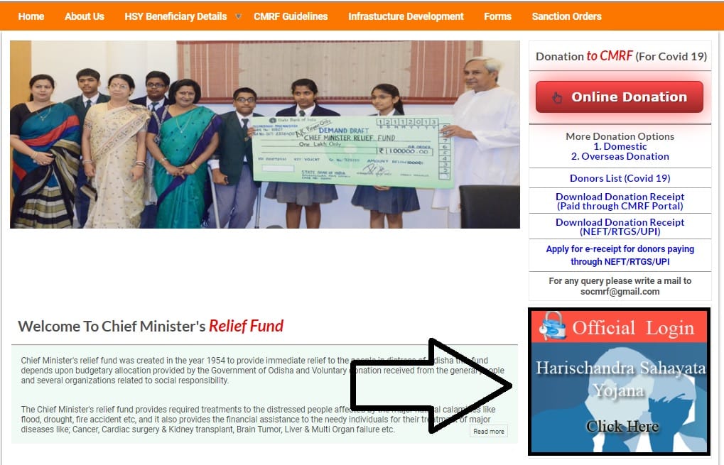 ଓଡ଼ିଶା ସରକାର cmrfodisha.gov.in ରେ ହରିଶଚନ୍ଦ୍ର ସାହତା ଯୋଜନା (HSY) ପାଇଁ ୱେବ୍ ପୋର୍ଟାଲ୍ ଲଞ୍ଚ କରିଛନ୍ତି। ଗରିବ ଏବଂ ଗରିବ ଲୋକଙ୍କୁ ସେମାନଙ୍କ ପରିବାର ସଦସ୍ୟଙ୍କ ଶେଷ ରୀତିନୀତି ତଥା ମୃତ ଦେହରେ ଶବଦାହ ପାଇଁ ଆର୍ଥିକ ସହାୟତା ଯୋଗାଇ ଦେଇଥିବାରୁ ହରିଚନ୍ଦ୍ର ସାହତା ଯୋଗ ଅଗଷ୍ଟ 2013 ରେ CMRF ରେ ମଧ୍ୟାହ୍ନ ଭୋଜନ କରାଯାଇଥିଲା।